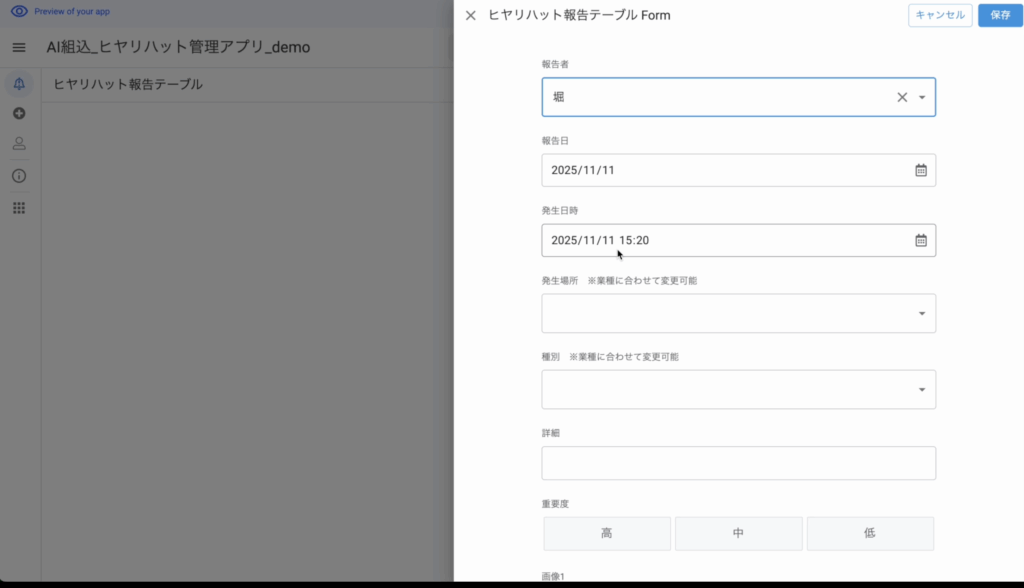 「報告者」「発生日」「発生場所」「種別」「詳細」「重要度」「再発防止策」などを入力するだけで、ヒヤリハットが登録され、一覧として蓄積されます。