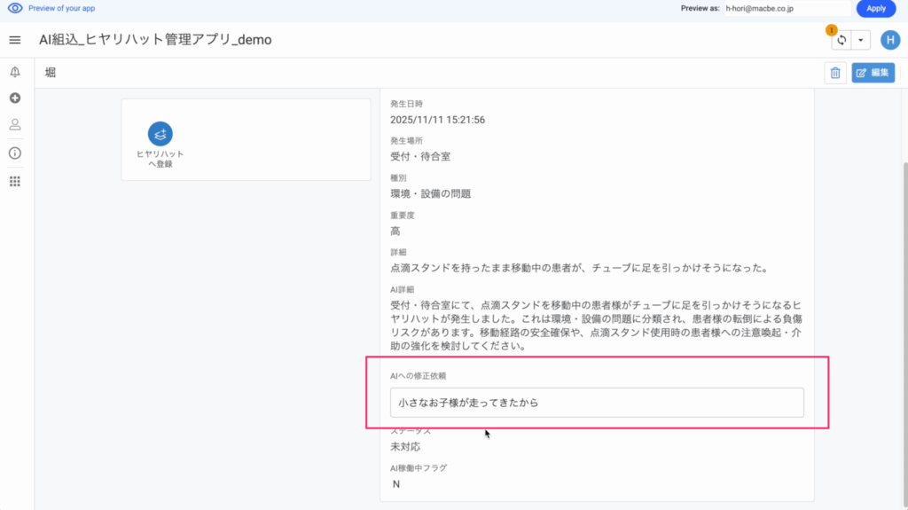 登録されたヒヤリハットの詳細文をもとに、Geminiが自動的に文章を補足します。